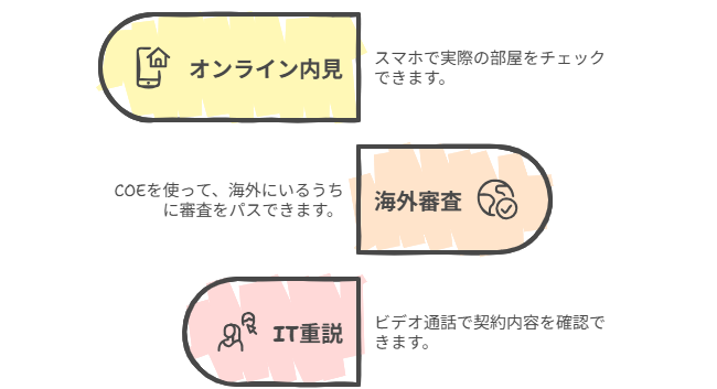 - 海外審査:COEを使って、海外にいるうちに審査をパス。